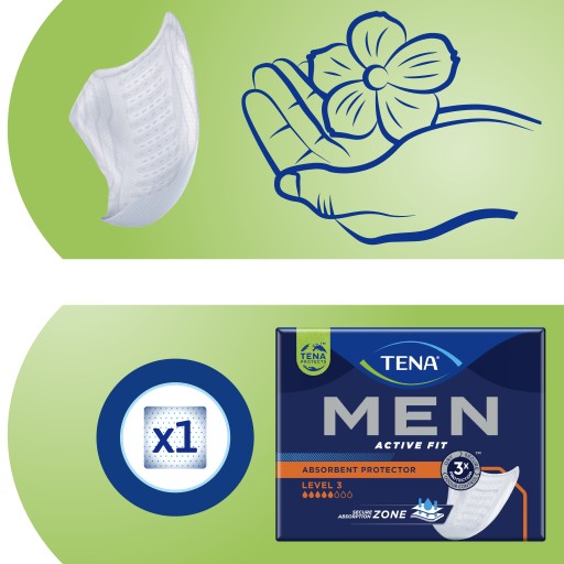 Wkładki TENA Men Active Fit Level 3 to potrójna ochrona – przed przeciekaniem, wilgocią i nieprzyjemnym zapachem.