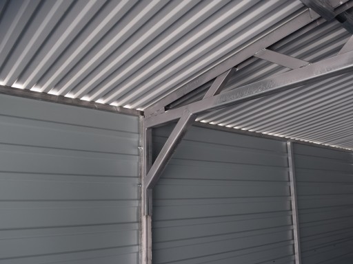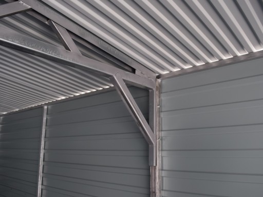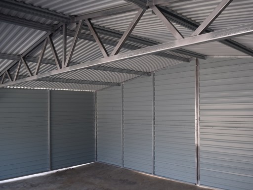 Garaż blaszany o szerokości 7,00 m (6,97 m) i długości 5,00 m (4,97 m). 2 bramy uchylne podnoszone do góry z przetłoczeniami blachy POZIOMO (przetłoczenia szerokości około 20 cm). Wysokość wjazdu 1,94 m. Dach dwuspadowy, wysokość całkowita w szczycie 2,65 m, wysokość ścian bocznych 2,13 m. Blacha akrylowa - drewnopodobna: ściany, obróbki i rynny CIEMNY ORZECH, bramy CIEMNY ORZECH, natomiast dach BTX8017 ciemny brąz matowy. Blacha do konstrukcji przymocowana nitami pod kolor blachy. Konstrukcja ścian wzmocniona profilami zamkniętymi 30x30 ocynkowanymi. OBRÓBKI BLACHARSKIE w kolorze CIEMNY ORZECH. Ściany wykonane z blachy T-7 w układzie POZIOMYM.