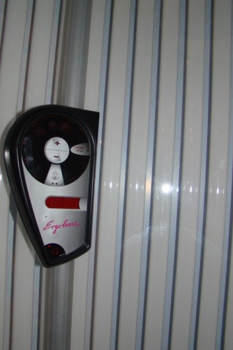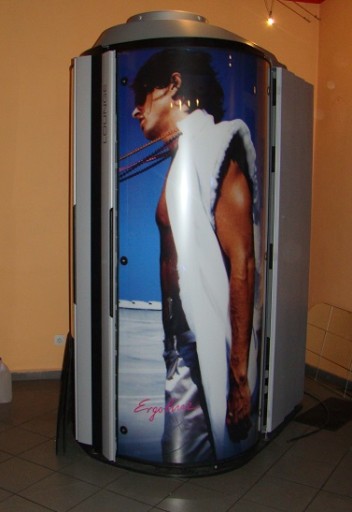 Ergoline Lounge z osłoną szklaną, na której znajduje się wielkoformatowe zdjęcie lifestyle i wbudowaną przebieralnią jest prawdziwym hitem w klasie solariów stojących.