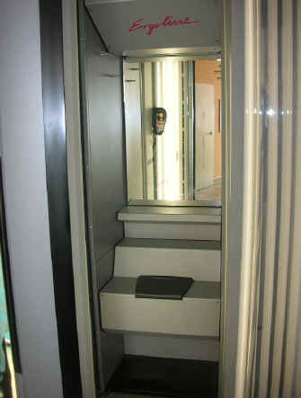 Przestrzeń w tylnej części solarium wyposażona jest we wszystko, co ułatwia przygotowanie się do opalania, jak również ubranie się po zakończonej sesji. Znajdują się w niej: podświetlane lustro, siedzisko, wieszaki na odzież i schowek na obuwie. Bowiem po opalaniu nikt nie powinien rezygnować z perfekcyjnej fryzury i nienagannego ubioru.