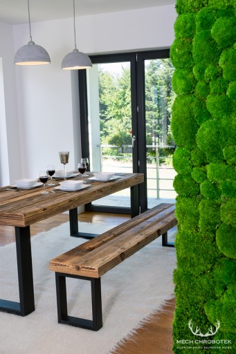 Najlepiej zrobić panele. Mech poduszkowy kleimy na florystyczny klej zgrzewalny do płyty, a następnie płytę zawieszamy lub przykręcamy do kołków na ścianie.