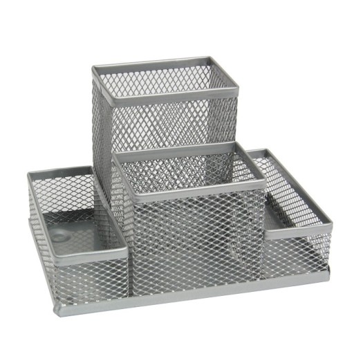 - przybornik posiada 4 przegrody widoczne na zdjęciu, przykładowo na długopisy oraz zszywki lub spinacze, oraz dwie wyższe przegrody na artykuły piśmiennicze