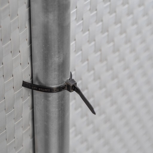MOCOWANIE: Montaż osłony balkonowo-tarasowej przebiega bardzo łatwo, a to dzięki dołączonym do produktu solidnym opaskom zaciskowym. Opaskę należy przepleść przez oczka maty (najlepiej dwa, lecz nie krańcowe), objąć szczebelek, a następnie zacisnąć osłonę i obciąć końcówkę opaski.