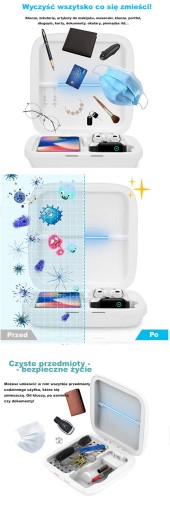 Działa nie tylko jako bezprzewodowa ładowarka, ale także pudełko do czyszczenia UV-C, które może całkowicie wyczyścić przedmioty w ciągu 3 minut oraz je naładować. Prosty sposób na utrzymanie czystości i zdrowia bez użycia płynów lub chemikaliów.