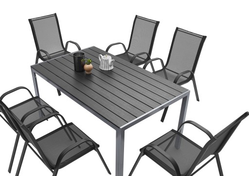 Konstrukcję stołu stanowi wysokiej jakości aluminium, malowane metodą proszkową. W oferowanym zestawie blat stołu wykonany jest z nieabsorbujących wody desek kompozytowych WPC, używanych między innymi do produkcji nowoczesnych systemów tarasowych i elewacji. Najważniejszym elementem konstrukcyjnym stołu są 4 profile aluminiowe w kształcie litery „U”. Ich zastosowanie sprawia, że po zmontowaniu całości stół jest wyjątkowo stabilny! Takie rozwiązanie pozwoliło na uzyskanie wolnej przestrzeni pod stołem i uniknąć niepotrzebnych dodatkowych konstrukcji przeszkadzających w wygodnym korzystaniu z mebli.