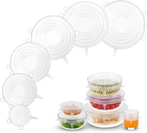 Pokrywki silikonowe na żywność zastąpią zwykłą folię aluminiową, zapobiegając przed wysuszeniem i zepsuciem się żywności. Dzięki swojej elastyczności świetnie dopasują się do pojemników o różnej wielkości wykonanej z dowolnego typu materiału (tworzywa sztuczne, ceramika, stal, porcelana itp.)