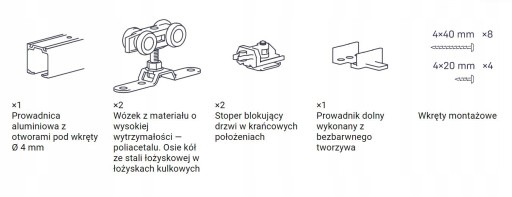 - Dostępne produkty uzupełniające: klamry mocujące prowadnicę do ściany, domykacz, uchwyty maskownicy drewnianej lub maskownica aluminiowa z zaślepkami bocznymi (w przypadku mocowania do ściany), maskownica aluminiowa paska (montaż maskownicy płaskiej możliwy również w przypadku prowadnicy mocowanej do sufitu, należy zastosować tulejki dystansowe)