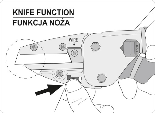 Nożyce wielofunkcyjne wysokiej jakości przeznaczone do cięcia rur miękkich, fibry, listew drewnianych, kartonu, papieru, a także drutu żelaznego. Ostrze frezowane i polerowane, wykonane ze stali sk5 o twardości 58-62 hrc posiadają dodatkowe ostrze do cięcia drutu, wykonane ze stali cr12mo o twardości 58-62 hrc. Skuteczna blokada wysuwu ostrza chroni operatora przed przypadkowym skaleczeniem. Znakomitym rozwiązaniem zastosowanym w nożycach jest ruchome kowadełko wykonane ze stopu cynku, które po wycofaniu odsłania ostrze, zmieniając nożyce w mocny nóż techniczny. W rękojeści znajduje się schowek z 4 zapasowymi ostrzami .