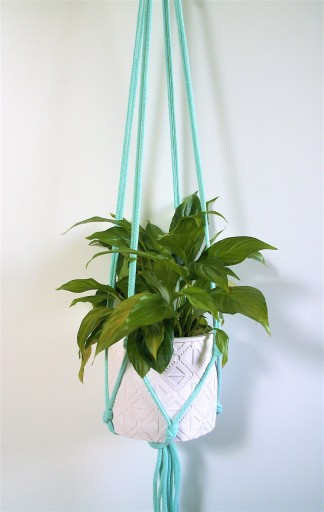 Kwietnik wyplatany techniką makramy z wysokiej jakości sznurka bawełnianego z wypełnieniem poliestrowym. Idealnie pasuje na doniczki o średnicy 10-15 cm. Kolor miętowy.