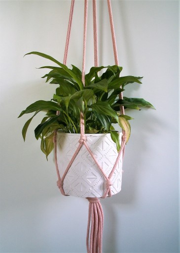 Kwietnik wyplatany techniką makramy z wysokiej jakości sznurka bawełnianego z wypełnieniem poliestrowym. Idealnie pasuje na doniczki o średnicy 10-15 cm. Kolor łososiowy.