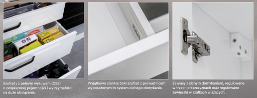 - Szafki zostały wyposażone w zawiasy z cichym domykiem w standardzie ( za wyjątkiem szafek narożnych )