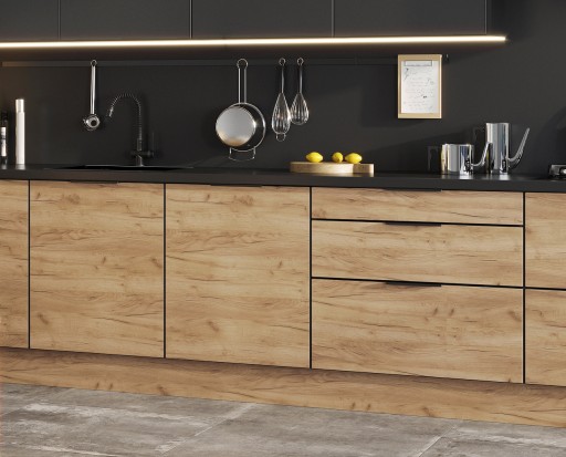 - Uchwyt w szafkach stojących: zintegrowany z obrzeżem czarny