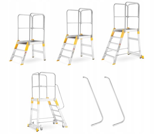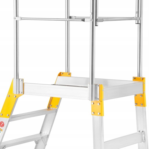 - Aluminiowe burty boczne zabezpieczające przed możliwością postawienia stopy poza platformą bądź przed spadkiem narzędzi z platformy