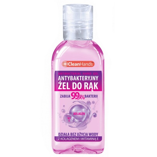Żel antybakteryjny CleanHands skutecznie oczyszcza i dezynfekuje skórę rąk. Działa bez użycia wody i mydła. Minimalizuje ryzyko zarażenia się bakteriami i wirusami. Żel bardzo dobrze się rozprowadza, wchłania, pozostawiając ręce w idealnej czystości. Zawiera witaminę E i kolagen zapobiegające nadmiernemu wysuszaniu skóry, pielęgnuje, odżywia i chroni.