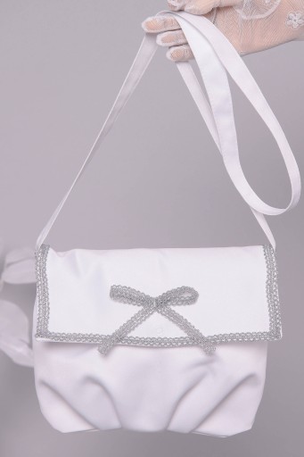 Podstawą kroju tego modelu torebeczki do Pierwszej Komunii jest większa prostokątna kieszeń marszczona w dolnej części zakładkami. Torebeczka komunijna z tej kategorii ma długi pasek i zamykana jest klapką na zatrzask.