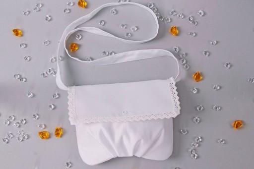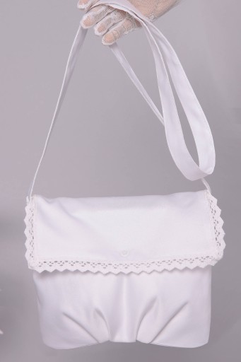 Podstawą kroju tego modelu torebeczki do Pierwszej Komunii jest większa prostokątna kieszeń marszczona w dolnej części zakładkami. Torebeczka komunijna z tej kategorii ma długi pasek i zamykana jest klapką na zatrzask.