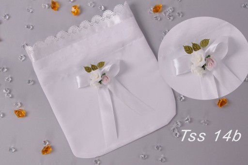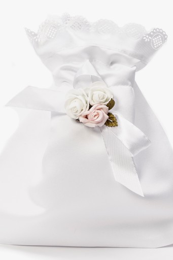 Podstawa kroju tego modelu torebeczki do Pierwszej Komunii jest większa sakiewka-woreczek marszczony w górnej części troczkami. Torebeczki komunijne sakiewki z satyny mają uchwyty w postaci podwójnych troczków dzięki czemu po ich zaciągnięciu kształtuje się ładna forma.