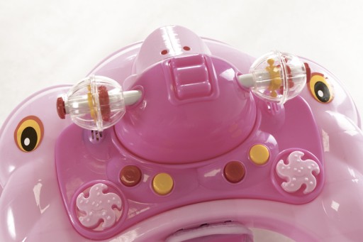 - chodzik posiada przyciski włączające muzykę ( 4 przyciski - 10 melodii) oraz pokrętła grzechotki,