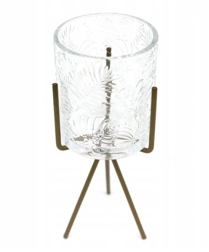 Świecznik wykonany ze szkła z efektownym stojakiem w kolorze złotym. Na powierzchni świecznika zastosowano charakterystyczne motywy roślinne, które w prosty i subtelny sposób przyzdobią każde wnętrze. Idealny do świeczek typu tealight, ale również znajdzie swoje zastosowanie jako malutki wazonik do niewielkich bukietów kwiatów.