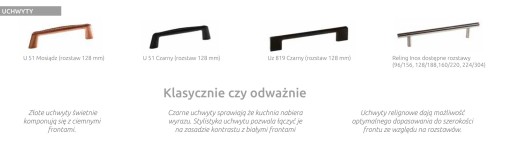 Kolekcja tej kuchni słynie z gustownych wersji kolorystycznych, prostego montażu oraz szerokiego wyboru opcjonalnych akcesoriów pozwalających dostosować zestaw kuchenny do własnych potrzeb i preferencji.