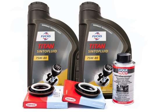 Zestaw uszczelniaczy półosi, olej przekładniowy FUCHS TITAN SINTOFLUID SAE 75W-80 2L oraz płukanka do skrzyni manualnej 6 - biegowej F40 oraz M32