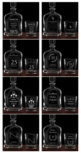 Wyobraź sobie, jak imponująco prezentuje się zestaw do whisky z subtelnym, eleganckim grawerem, zajmujący honorowe miejsce w Twoim domowym barku.
