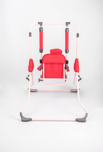 Huśtawka dziecięca z barierką i rozkładanym oparciem. Huśtawka z miękką barierką została w pełni wyprodukowana w polskich wytwórniach z grubej rurki stalowej i wysokiej jakości tkanin. W przeciwieństwie do tańszych, chińskich odpowiedników charakteryzuje się o wiele lepszą trwałością i jakością wykonania.
