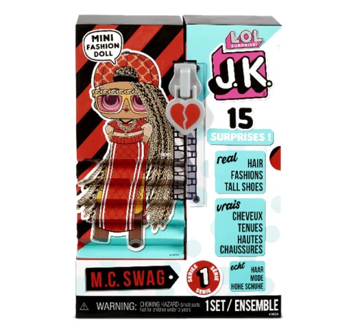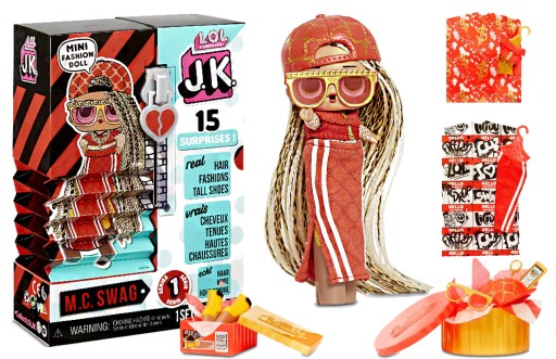 MC SWAG jest przebojowa tak jak jej starsza siostra. Uwielbia modę w stylu Hip Hop dlatego jej kreacja utrzymana jest dokładnie w tym nurcie. Posiada wystrzałowe buty na ogromnym koturnie, spódnicę, bluzeczkę, mega czapkę z daszkiem oraz najważniejszy atrybut każdej gwiazdy czyli kolorowe okulary! Fryzura MC J.K. SWAG to piękne długie błąd warkoczyki którymi wyróżni się na tle pozostałych lalek z kolekcji! Włosy można dowolnie stylizować.