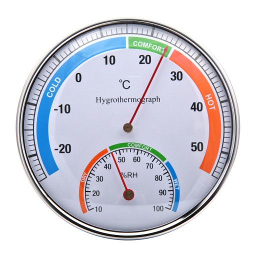 Analogowy termometr z higrometrem. Termometr przeznaczony do użytku wewnątrz pomieszczeń lub na zewnątrz pod warunkiem osłonięcia przed deszczem/śniegiem.