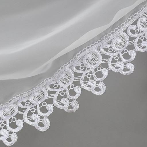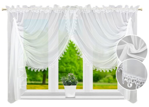 Brzegi firanki wykończone są piękną gipiurą 8 cm oraz dwoma wszytymi taśmami marszczącymi do ściągnięcia firany na boki.