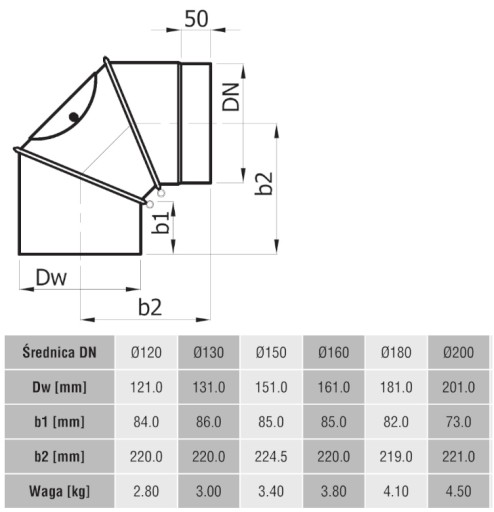 Kolano zaopatrzone jest w jeden otwór rewizyjny z uszczelką ceramiczną (dostępna w sprzedaży).