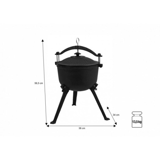 Kociołek wykonany w całości z żeliwa - odlew maszynowy; Wyposażony w zamykaną, Zakręcaną pokrywę, Nóżki demontowalne; Do pieczenia i gotowania na ognisku; Pojemność 7,5 litra