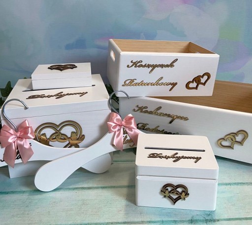Na zewnątrz pudełka naklejony przestrzenny dekor gołąbki lub serca ( dekor lakierowany w kolorze złotym lub srebrnym) w zależności od wybranego modelu