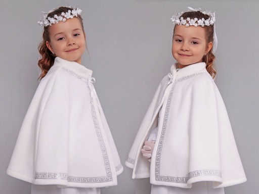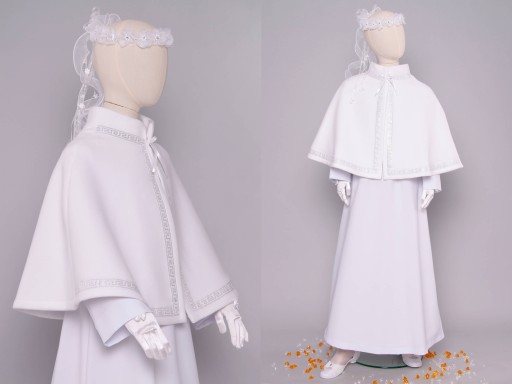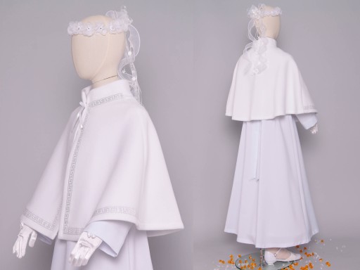 Pelerynka stanowi doskonałe zabezpieczenie przed ewentualnym chłodnym dniem podkreślając charakter stroju komunijnego.
