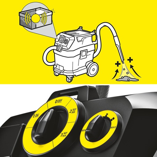 Odkurzacz wyposażony w gniazdo do podłączania elektronarzędzi z funkcją automatycznego włączania / wyłączania. Pozwala na wygodną pracę z elektronarzędziami i odsysanie pyłu powstającego podczas pracy w miejscu jego powstawania.