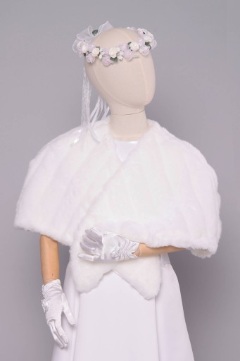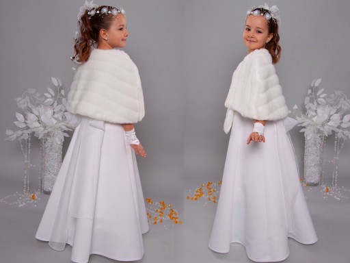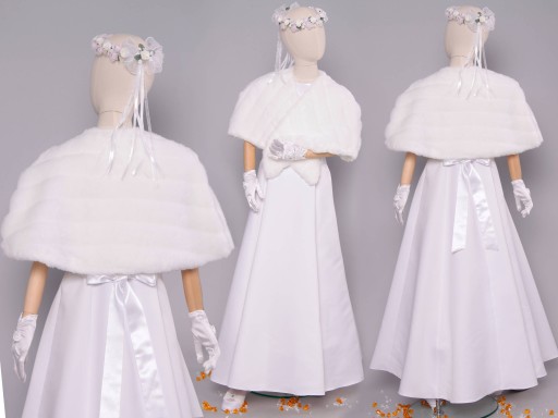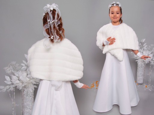 Ciepła etola - płaszczyk dla dziewczynki na uroczystość pierwszokomunijną. Niecodzienne okrycie wierzchnie jedno z najbardziej eleganckich w naszej ofercie. Białe sztuczne futerko z motywem norki zadowoli oczekiwania małych dam. Każda dziewczynka może poczuć się w niej komfortowo za sprawą klasycznego fasonu i cieplutkiej tkaniny. Nietuzinkowy krój nawiązujący do balowej elegancji nadaje naszej etoli komunijnej niepowtarzalnego smaku. Wzmacnia on też wygodę noszenia dzięki zaokrąglonemu cieciu wzdłuż rąk. Wewnętrzną warstwę etoli komunijnej stanowi biała podszewka.