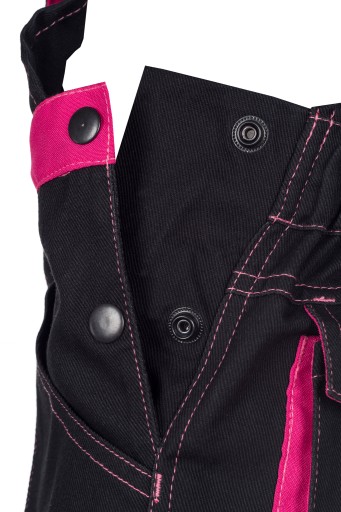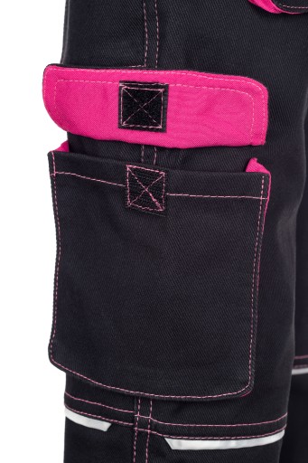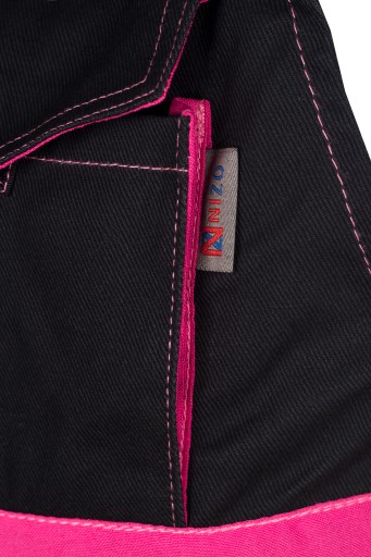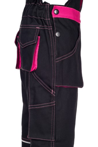Spodnie ogrodniczki dziecięce NIZO CZ/R charakteryzują się nowoczesnym designem. Odzież wykonano z wysokiej jakości 100% bawełny o gramaturze 280 g/m2 która zapewnia maksymalny komfort podczas zabawy i zapewnia wytrzymałość na rozdarcia. Dziewczęce warianty kolorystyczne czarno-różowe. Spodnie zostały dodatkowo wyposażone w elementy odblaskowe która zwiększa bezpieczeństwo dzieci. Wiele praktycznych kieszonek pomieści narzędzia i smakołyki. Ogrodniczki w pasie posiadają elastyczną gumkę dzięki której spodnie dopasowują się znakomicie do sylwetki. Szelki z możliwością regulacji. Starannie uszyte i wykonane przez rodzinną polską szwalnię.