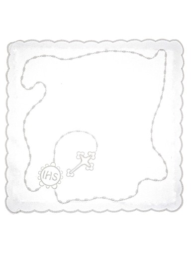 Pamiątka komunijna haftowana CH6 ma kształt kwadratu z lekkimi zaokrągleniami, ozdobiona motywem różańca. Haft jest biały co dodaje pamiątce wdzięku. Ze względu na delikatność i piękny wzór jakim jest wyhaftowany różaniec polecamy ją zarówno dla chłopców i dziewczynek, którym bardzo się ona podoba.