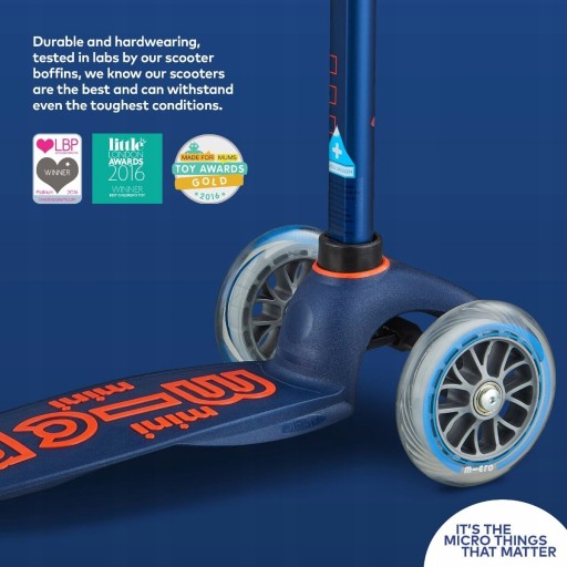 MiniMicro DELUXE® to zrewolucjonizowana wersja swojej poprzedniczki- MiniMicro. Opcja DELUXE zyskała nie tylko większe wyeksponowanie marki, lepszy uchwyt, ale i regulację wysokości oraz anodowany drążek kierownicy, co zdecydowanie wpływa na wydłużenie czasu użytkowania przez dzieci. Waży tylko 1,99 kg, łatwo ja podnieść i nosić, jest to idealne rozwiązanie na codzienne spacery z dzieckiem. Dodatkowo małe wymiary sprawiają, że jej transport jest wyjątkowo łatwy, wystarczy wyjąć sztycę kierownicy z podestu i hulajnoga zmieści się w każdym bagażniku czy schowku. Dwa kółka umieszczone z przodu zapewniają większą stabilność sprzętu oraz łatwiejszą kontrolę. Dziecko nie obawia się, że hulajnoga wywróci się co jest bardzo istotne podczas pierwszych przygód na tego typu sprzęcie. System skręcania jest niezwykle płyny, jedyny taki na rynku. Kółka z poliuretanu zapewniają gładką i cichą jazdę, radość dla dzieci i ulga dla rodziców i przechodniów! Podest hulajnogi o antypoślizgowej powierzchni jest zawieszony nisko nad ziemią i jest na tyle długi, że mieszczą się na nim obie stopy, dzieci więc bez trudu wskakują i zeskakują z hulajnogi, a także bez problemu przechodzą od odpychania do jazdy. Łyżkowy hamulec z tyłu zapewnia dodatkowe panowanie nad pojazdem. Stalowa wkładka pokryta jest plastikiem dzięki czemu nie nagrzewa się podczas hamowania.