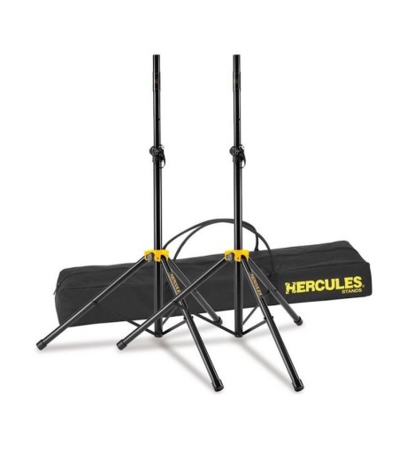 Zestaw 2 lekkich składanych statywów kolumnowych na trójnożnych podstawach.