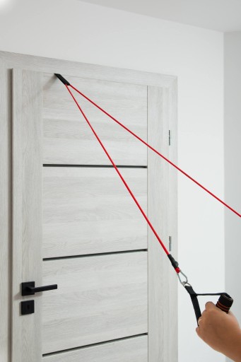Uchwyt montażowy do drzwi, który znajduje się w zestawie zapewnia solidne zamocowanie ekspanderów. Samo zamocowanie jest bardzo łatwe i nie wymaga użycia żadnych narzędzi. Wystarczy umieścić tzw. kotwicę pod lub nad drzwiami , a następnie je zamknąć.