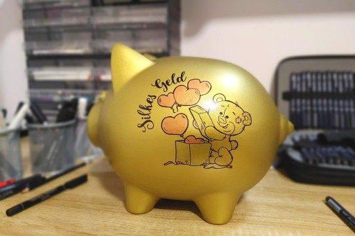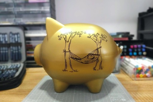 Teksty oraz proste grafiki umieszczamy na skarbonkach ręcznie, markerami do ceramiki lub przenosimy na skarbonkę metodą termotransferu.