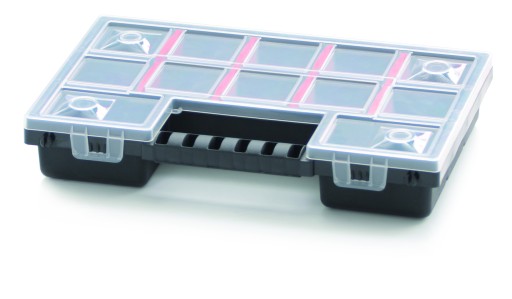 Organizer posiada 12 przegródek, które można wyjmować oraz poręczny uchwyt, który ułatwi przenoszenie skrzynki.