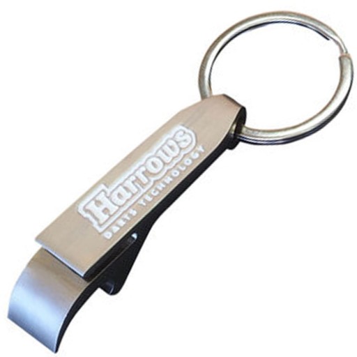 Otwieracz do butelek z logo Harrows, posiada przypinkę do kluczy lub smyczki.