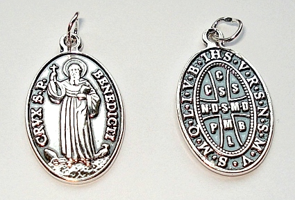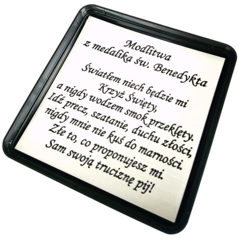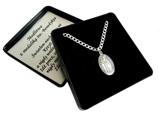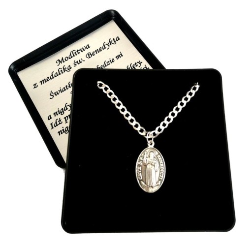 Komplet zapakowany w firmowe pudełeczko, w wieczku wklejona tabliczka na której jest wygrawerowana treść modlitwy z medalika św. Benedykta.