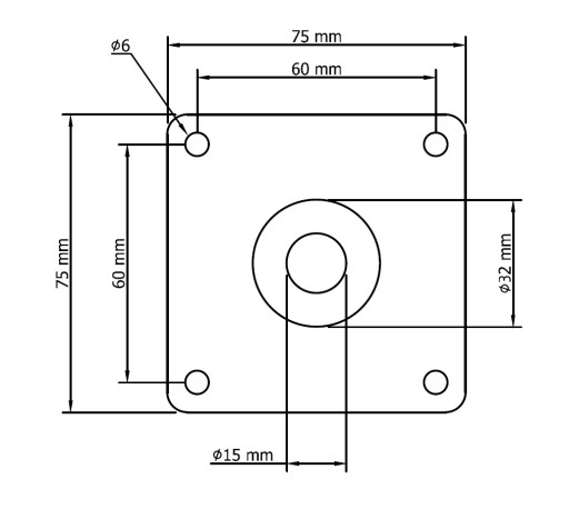 - Rozmiar blachy montażowej wynosi 75 x 75 mm o grubości 2,5 mm oraz posiada 4 otwory montażowe w rozstawie 60 mm o rozmiarze 6 mm każdy. Do montażu polecamy wkręty metryczne M6 z grupy 562 oraz mufy wkręcane z gwintem M6 lub wkręty stożkowe lub podkładkowe o średnicy 4,5 - 6,0 mm.