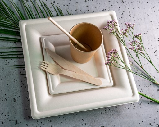 - 12 kwadratowych talerzy z trzciny cukrowej ( wymiary 26x26 cm )