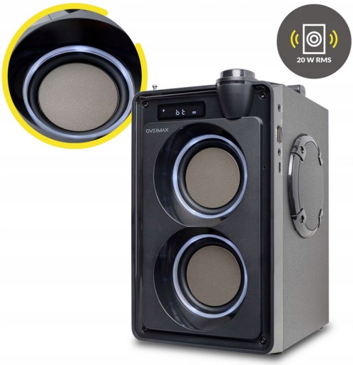 Głośnik bezprzewodowy Overmax Soundbeat 5.0 został wyposażony w dwa wysokiej jakości głośniki o łącznej mocy 20 W RMS. Głośniki wsparte są pasywnymi radiatorami, które nadają głębię niskim tonom, zapewniając mocne basowe uderzenie.