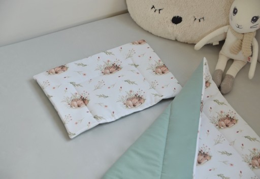 Jedna strona biała w sarenki i kwiatki (100% bawełna premium), druga w kolorze szałwiowym (100 % bawełna).