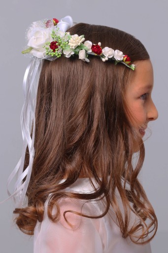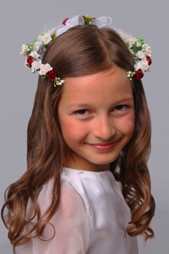 Półwianek komunijny należy do kolekcji wianki jak żywe od kwiaciarki. Wspaniale prezentuje się na każdej dziewczynce niezależnie od wybranej na ten dzień fryzury.